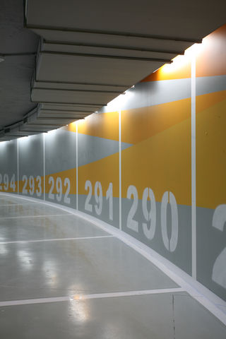 The design of the car park project in Plaza Cánovas offers the city and its inhabitants an unsuspectedly sustainable and environmentally friendly space. The huge illustrations covering the walls refer to various parts of the city of Valencia and indicate the routes and the time it takes to walk to them. Each space is a colourful spectacle classified into four floors reflecting the amount of geographical space in the city with respect to: water = blue, natural spaces = green, cultural spaces = red, leisure centres = yellow.